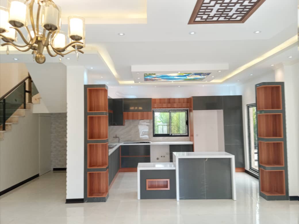 می رسیم به فضای داخلی ویلا. کف فضای داخلی از فضای اشپزخانه گرفته تا اتاق نشیمن و اتاق خواب ها با کفپوش سرامیک زیبا شده و به جذابیت های فضای داخلی اضافه کرده است. همچنین داخل فضای اشپزخانه کابیت هایی مدرن و شیک نصب شده اند که خیالتان را از بابت این فضا آسوده می کند.