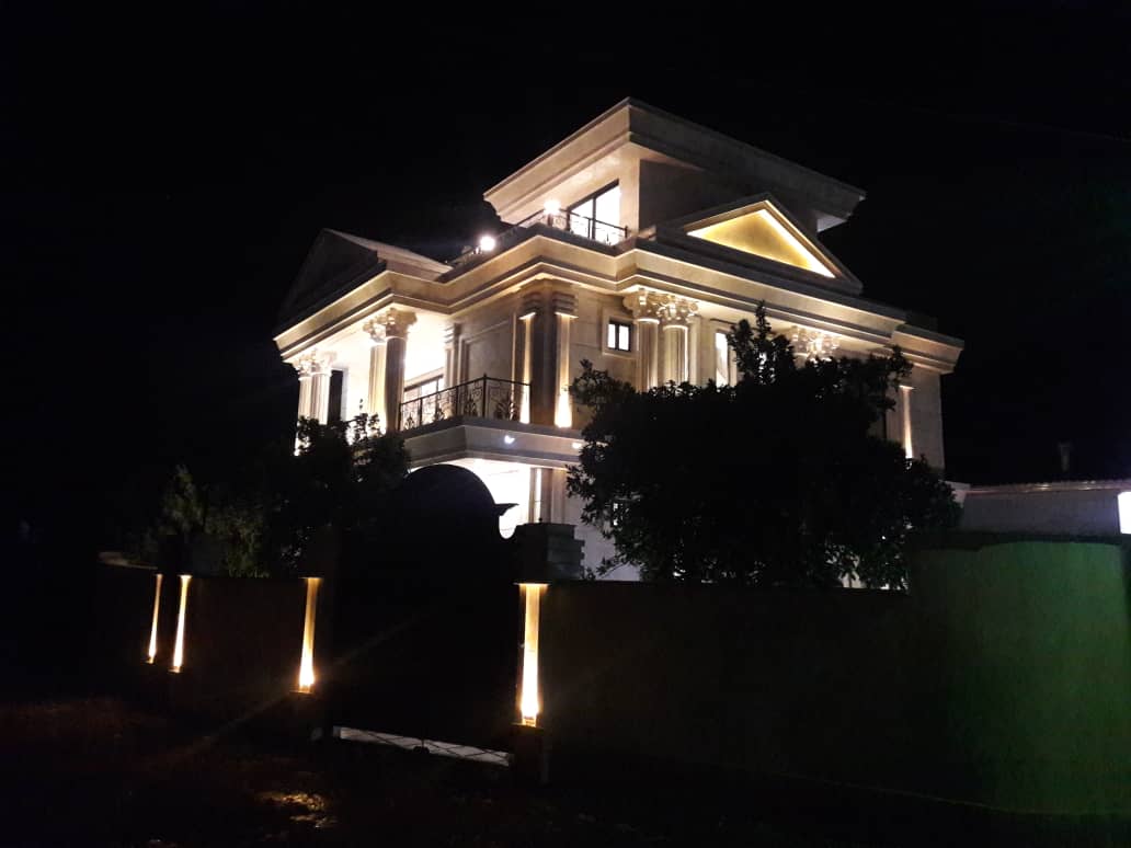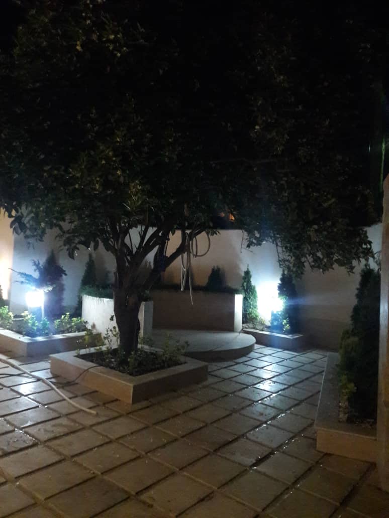 برای درب ورودی حیاط ویلا از در نفررو کوچک و یک درب بزرگ پارکینگ استفاده شده است. حیاط ویلا آنقدرها بزرگ نیست اما همان فضای محدود نیز تمام فضاسازی شده و از باربیکیو، آلاچیق و نورپردازی خاصی برای مجهزتر و زیباتر شدن حیاط خانه استفاده شده است. ویلا به لحاظ امنیت دارای یک نگهبانی تمام وقت است و از سیستم دوربین مدار بسته به جهت تسلط بر امنیت فضا، استفاده شده است.