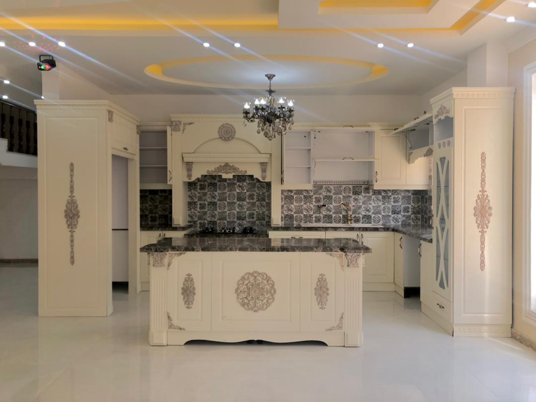 پس از گذشتن از محوطه ی حیاط و زیبایی های بی نظیرش، به درب ورودی بنا خواهید رسید که یک درب ضد سرقت است. پس از ورود به محوطه ی داخلی کاخ ویلا در طبقه ی اول شاهد یک فضای پذیرایی بزرگ به همراه یک آشپزخانه ی شیک مجهز به کابینت ممبران خواهید بود. سقف فضا کاملا کناف و به همراه نورپردازی می باشد و انواع کاغذ دیواری برای فضاسازی داخلی استفاده شده است.